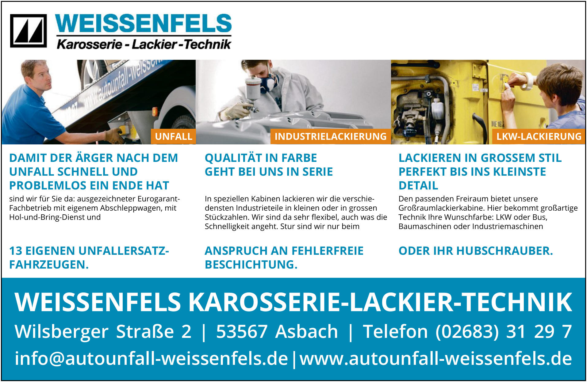 Von Hans Weissenfels wurde das Unternehmen 1950 in Neustadt gegründet. Seit 2001 hat der Eurogarant-Fachbetrieb seinen Standort in Asbach. Heute reparieren rund 60 Mitarbeiter auf 4.000 m2 pro Woche etwa 80 Unfallschäden. Auch wenn sich vieles geändert hat: Die Ansprüche an die Qualität der Arbeit, die individuelle Betreuung der Kunden und das Interesse daran, die neuesten Entwicklungen rund um das Thema Lackierung aufzugreifen, stehen im Unternehmen bis heute im Mittelpunkt. Das dürfte auch damit zusammenhängen, dass die Firma durchgängig in der Hand der Familie geblieben ist. Derzeit werden die Weichen dafür gestellt, dass das auch weiterhin so bleibt.