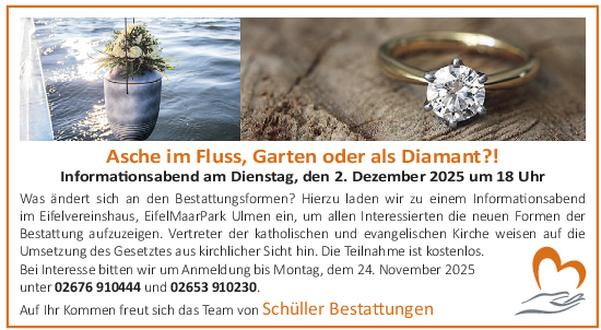 Wenn ein Mensch geht, bleibt mehr zurück als Trauer. Es bleiben Erinnerungen, Gesten, Spuren eines gelebten Lebens. Schüller Bestattungen mit Standorten in Kaisersesch und Ulmen hat es sich zur Aufgabe gemacht, diesen Erinnerungen Raum zu geben – mit Abschieden, die so individuell sind wie die Menschen selbst. Unter dem Leitgedanken „Jeder Mensch ist anders. Und verdient einen einzigartigen Abschied“ begleitet das Familienunternehmen Angehörige in einer der sensibelsten Phasen ihres Lebens – respektvoll, persönlich und verlässlich.