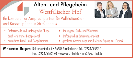„Mehr Lebensqualität im Alter“ ist der zentrale Leitsatz des Alten- und Pflegeheims „Westfälischer Hof“ inmitten des staatlich anerkannten Luftkurortes Straßenhaus im Naturpark Rhein-Westerwald. Die barrierefreie Einrichtung verfügt über 59 Pflegeplätze in gemütlich eingerichteten Einzel- und Doppelzimmern. Diese haben Dusche/WC, TV und Telefonanschluss, teilweise Balkon/Terrasse sowie eine direkte Anbindung an die zentrale Rufanlage.