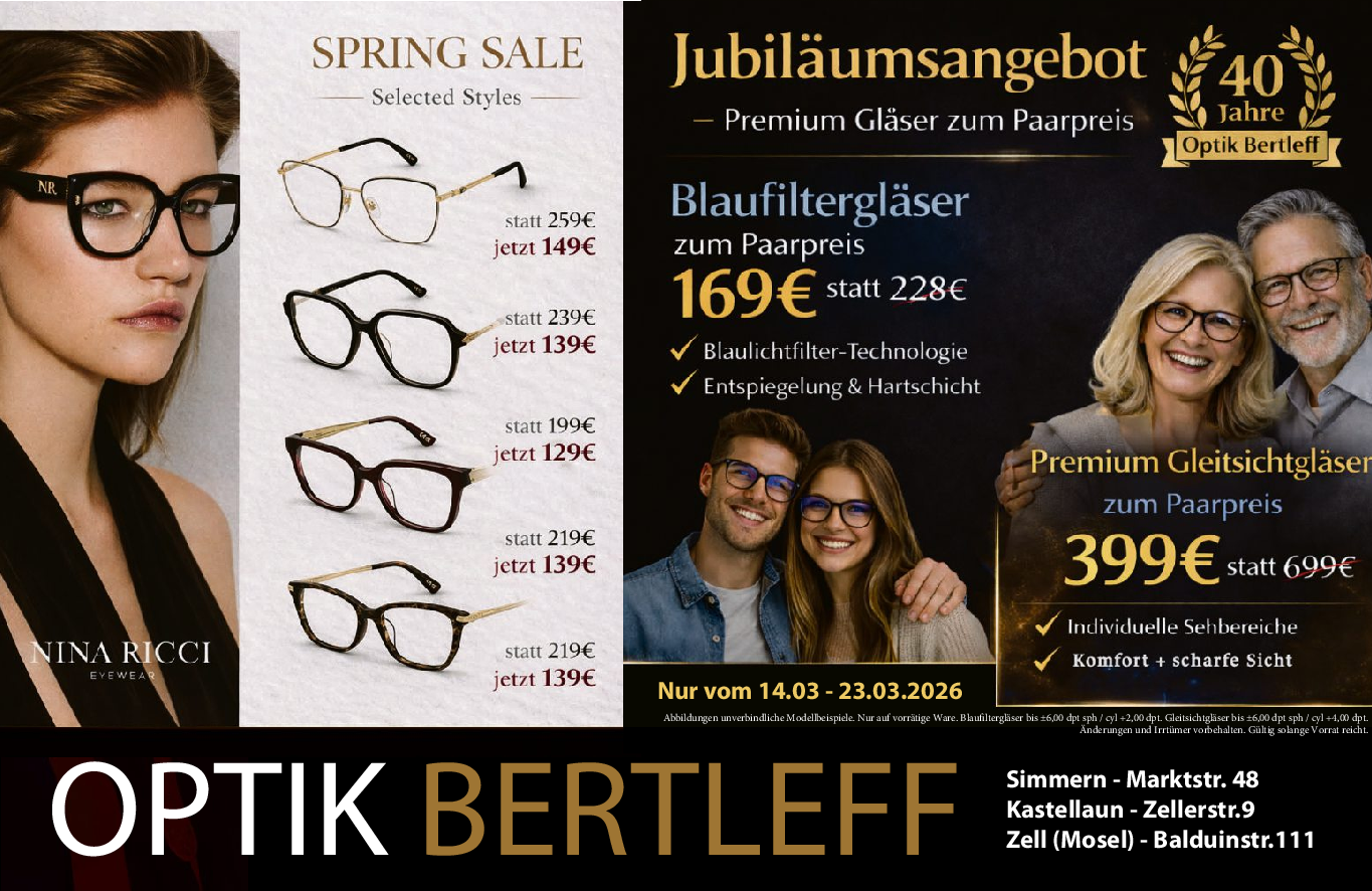 Gemeinsam stehen Fritz Bertleff und Daniel Lehmann für eine klare Linie: handwerkliche Substanz trifft auf moderne Innovation. Bewährte Kompetenz verbindet sich mit digitaler Messtechnik, präziser Analyse und individuellen Sehkonzepten auf höchstem Niveau. Unter der Führung von Daniel Lehmann wurden die Standorte strategisch weiterentwickelt. Neben dem Stammhaus in Kastellaun und der Filiale in Zell an der Mosel setzt auch Simmern im Hunsrück ein starkes Zeichen. In diesem Jahr zog die Filiale von der Marktstraße 47–49 in die neuen, modernen Geschäftsräume in der Marktstraße 48 um. Helle Räume, hochwertige Ausstattung und modernste Technik schaffen dort ein Beratungserlebnis, das Tradition und Zeitgeist sichtbar vereint.