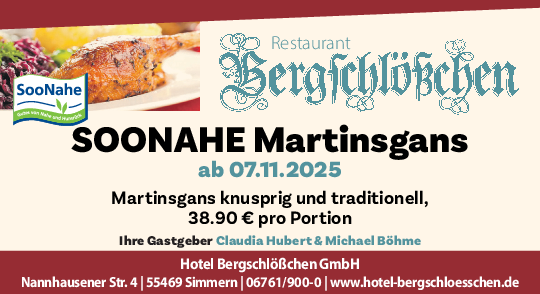 „Widmen Sie sich mit Freunden oder Familie der Gans auf dem Teller, genießen Sie Ihre SooNahe-Martinsgans auch ganz einfach zu Hause. Bei Fragen zum passenden Nahewein beraten und versorgen Sie unsere Gastronomen natürlich ebenfalls gerne“, lädt SooNahe-Geschäftsführer Klaus Wilhelm ein.
