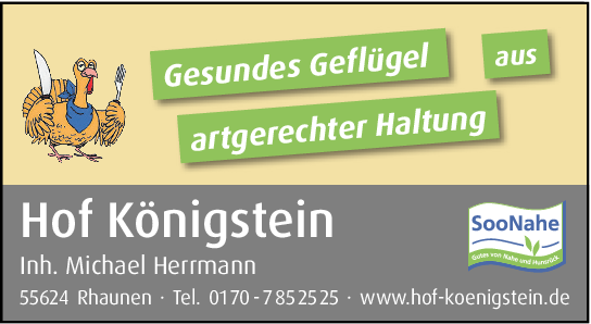 „SooNahe – Gutes von Nahe und Hunsrück“ setzt auf Hunsrücker Bauern, die unter Beachtung des Tierwohls Gänse freilaufend und mit hofeigenem Futter aufziehen – garantiert gentechnikfrei und ohne Antibiotika. Diese Tiere entwickeln ein hervorragend schmeckendes Fleisch und wurden unter besten Bedingungen aufgezogen, beispielsweise beim SooNahe-Betrieb Hof Königstein in Rhaunen. Die Küchenchefs der SooNahe-Gastronomie kreieren daraus eine Fülle köstlicher Gerichte. Gans traditionell mit Knödel und Rotkohl, Kartoffeln und Rosenkohl oder mit Maronen, aber auch asiatisch inspirierte Kreationen finden ihren Platz.