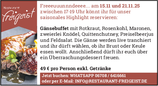 Endlich kommt wieder Gans auf den Tisch. Das verspricht herbstlich-vorweihnachtlichen Genuss in gemütlicher Runde. Freunde von Gänsekeule, Gänsebraten oder im Ganzen gebratener Gans können sich auf tolle Wochen freuen, denn der Genuss liegt ganz nahe.