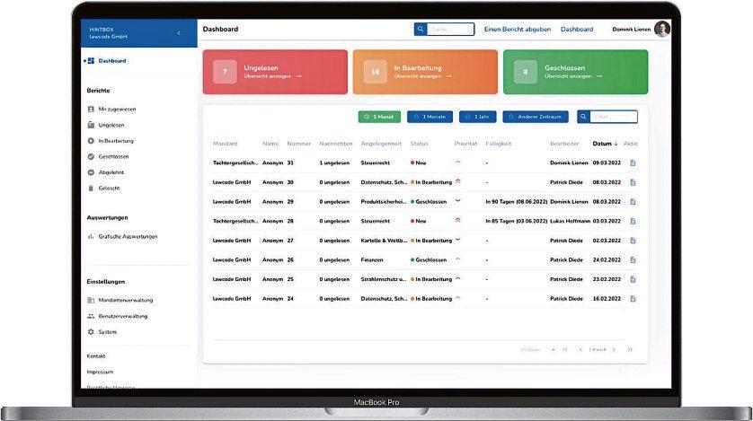 Worauf die Programmierer von lawcode besonders stolz sind, ist der leichte intuitive Umgang mit dem Programm. Über 80 Firmen arbeiten bereits mit der „Hintbox“ und die vier Gründer hören immer wieder, wie leicht zu bedienen es sei, und dass auch Angestellte ohne juristische Ausbildung die Fälle bearbeiten könnten. Dem Bearbeiter werden je nach Vorfall – ob Geldwäsche oder sexueller Übergriff – Handlungsmaßnahmen vorgegeben, die nacheinander abgearbeitet werden sollten, um klären zu können, ob die Tatsache einer gesetzeswidrigen Handlung vorliegt. Dass das System funktioniert, zeigen die zahlreichen und namhaften Kunden, die bereits erfolgreich mit „Hintbox“ arbeiten. Petra Dettmer