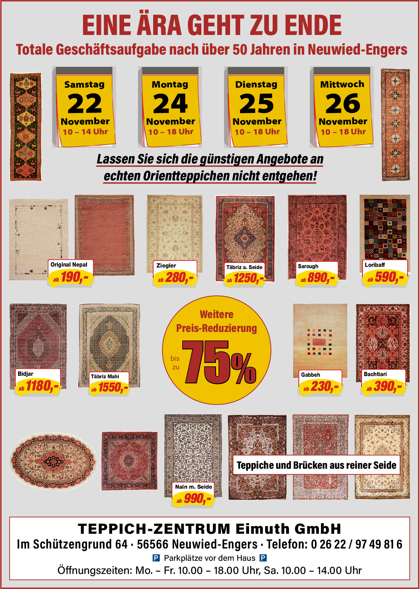 Zu Preisen, die teils deutlich unter dem Einkaufspreis liegen, hochwertige Teppiche zu erwerben, ist eine Gelegenheit, die kaum noch einmal kommen wird. Im Teppichzentrum Eimuth im Engerser Schützengrund bietet sich diese einmalige Gelegenheit. Das Unternehmen trennt sich von diesem Geschäftsbereich und löst seine einzigartige Vielfalt an Teppichen aus allen Ländern, in denen die Teppichknüpfkunst seit Jahrhunderten eine große Tradition hat, auf.