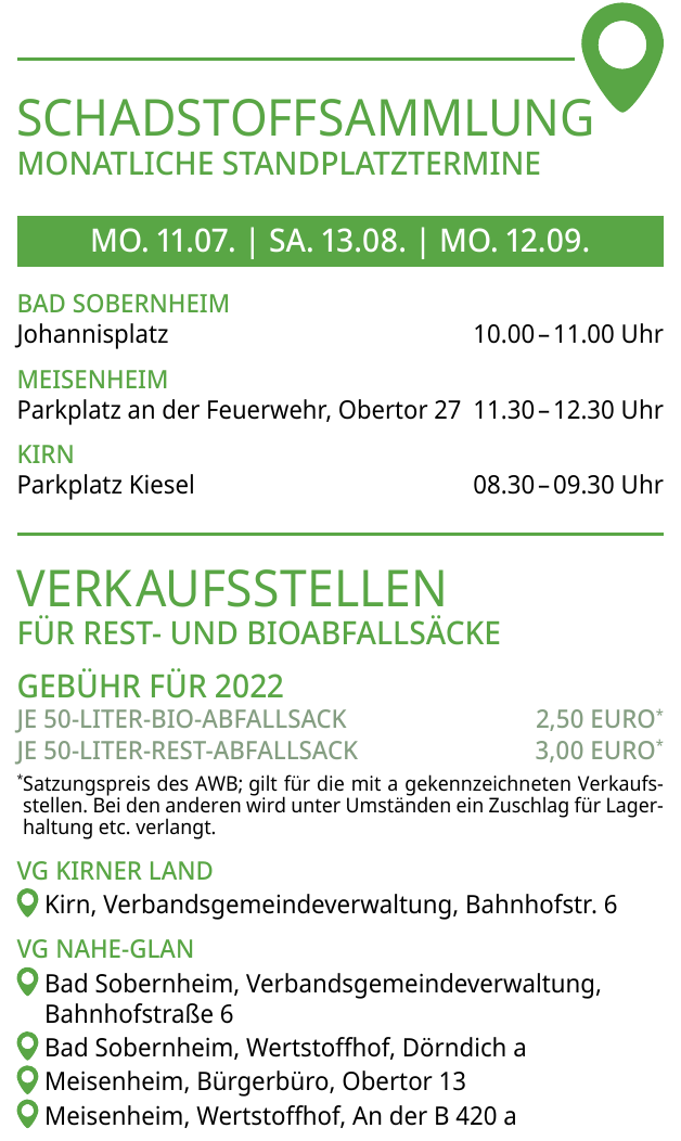 MEDIKAMENTE dürfen nur bei Müllverbrennung in die Restabfalltonne! Im Landkreis Bad Kreuznach sind das Schadstoffe, daher (ohne Umverpackung und Beipackzettel) am Schadstoffmobil abgeben.