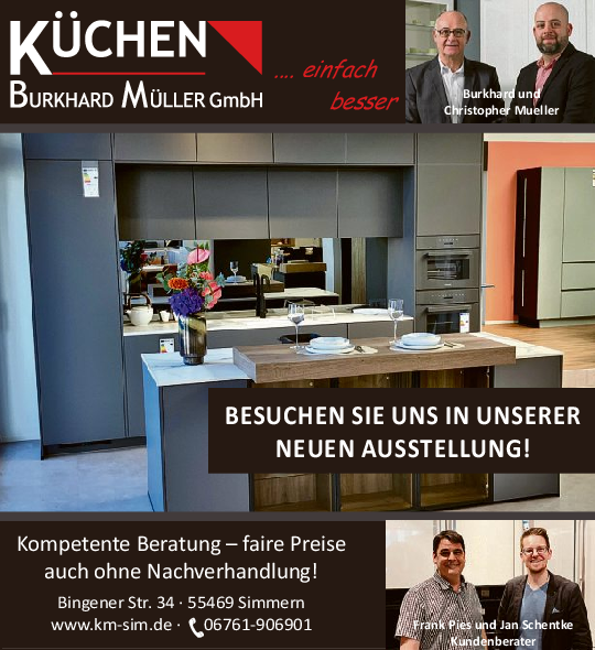 Seit über 20 Jahren ist die Küchen Burkhard Müller GmbH im Hunsrück bekannt für hochwertige Einbauküchen und Wohnlösungen. Was 2004 klein begann, ist heute ein mittelständisches Familienunternehmen mit fast 30 Mitarbeitern. Seit Mai gibt es eine modernisierte Ausstellung in Simmern. Auf 1.000 Quadratmetern zeigt das Haus rund 20 Küchen, drei Esszimmer, drei Wohnlösungen und zwei Hauswirtschaftsräume. Die Bandbreite reicht von modern bis ländlich-gemütlich, neu ergänzt durch Badmöbel. „Wer Kunden begeistern will, muss mit seiner Ware am Puls der Zeit sein“, so Geschäftsführer Christopher Müller. Die Philosophie des Hauses: familiär, kundenorientiert und fair. Statt großer Werbung setzte das Unternehmen von Beginn an auf Empfehlungen zufriedener Käufer. Ein Erfolgsfaktor ist die transparente Preisgestaltung – jeder Kunde erhält sofort einen fairen Endpreis. Christopher Müller betont: „Wir wollen, dass unsere Kunden mit ihrer neuen Küche glücklich sind.“ Deshalb plant das Team individuell, begleitet bis zur Montage und bleibt auch danach Ansprechpartner. Mit Herzblut und einem starken Team blickt das Unternehmen optimistisch in die Zukunft.