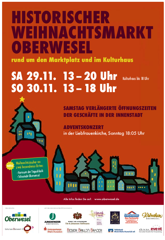 Am ersten Adventswochenende ist es wieder so weit: Der Weihnachtsmarkt in Oberwesel lädt traditionell zum Bummeln, Schlemmen und Genießen ein. Am Samstag, 29. November, und Sonntag, 30. November, verwandeln sich der historische Marktplatz, die Rathausstraße und das Kulturhaus in ein festlich funkelndes Winterparadies.
