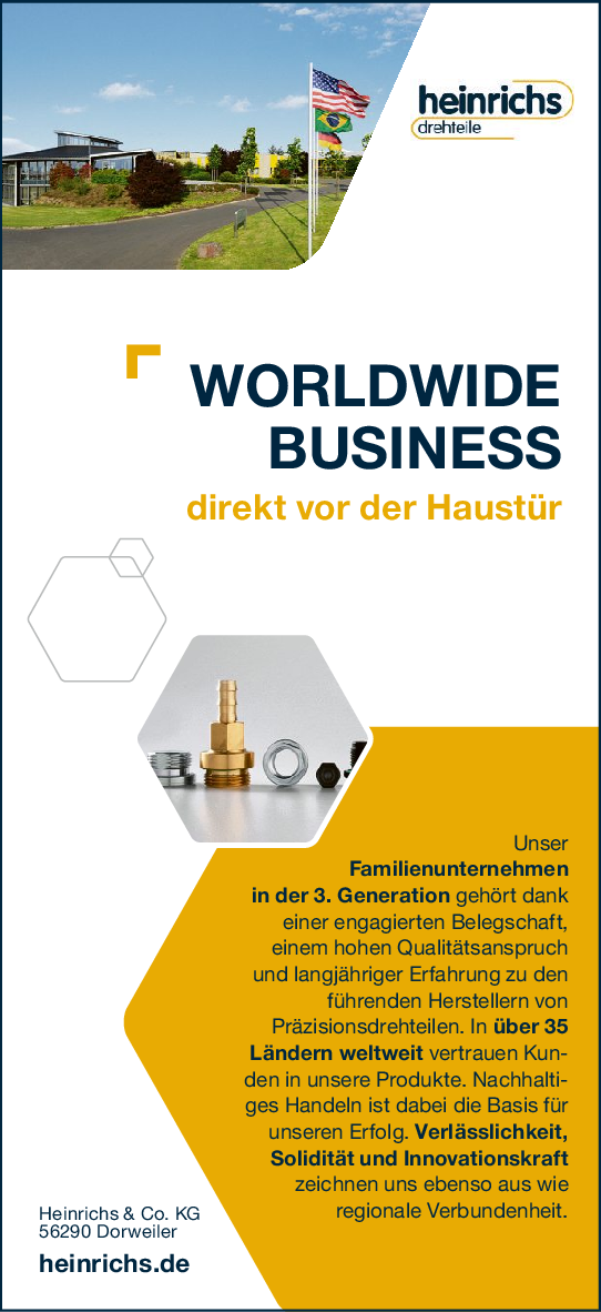 Innovation ist nicht zwangsläufig an industrielle Ballungsräume gebunden – das beweist heinrichs drehteile seit mittlerweile über 90 Jahren. Der führende Hersteller von Präzisionsdrehteilen fertigt an seinem Standort in Dorweiler für anspruchsvolle Anwendungen in Hydraulik und Pneumatik weltweit.