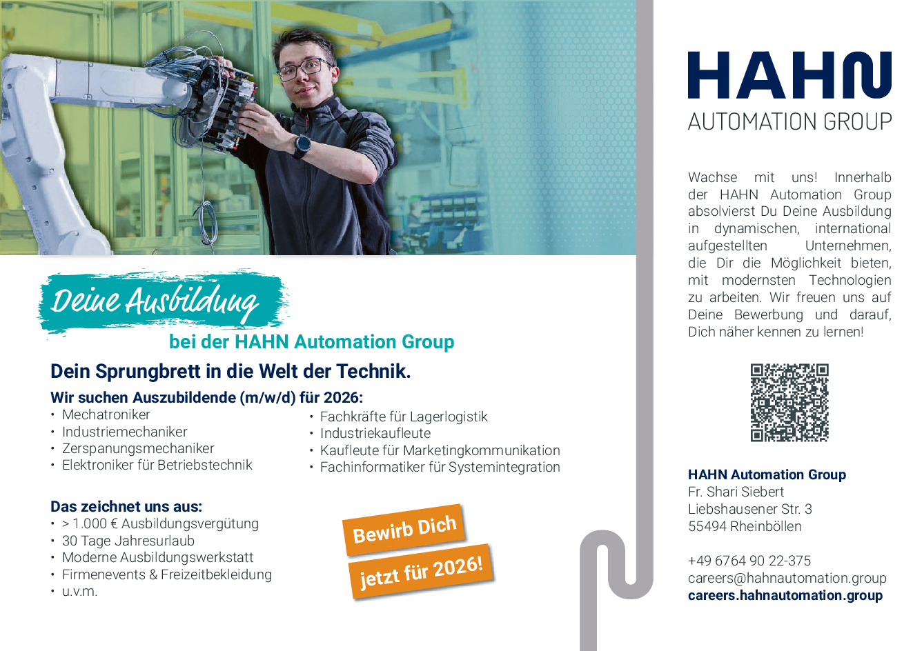 Der Schulabschluss ist ein wichtiger Meilenstein - und gleichzeitig der Beginn einer spannenden Suche nach dem richtigen beruflichen Weg. Viele Eltern fragen sich, wie sie ihre Kinder bestmöglich bei dieser Entscheidung unterstützen können. Orientierung ist deshalb besonders wertvoll. Ein Unternehmen, das Jugendlichen im Rhein-Hunsrück-Kreis und weit darüber hinaus hervorragende Perspektiven eröffnet, ist die HAHN Automation Group mit Hauptsitz in Rheinböllen.